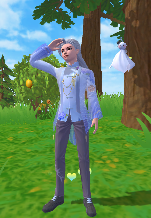 The boys have long hair tied high in a ponytail, and the bangs are combed diagonally, like a young hero who is just entering the arena. The top is made of gradient white and purple, with large blooming light blue hydrangeas embroidered on the shoulders and hem, a refreshing transparent gauze tunic, golden beads on the chest, and black suits and trousers. gas.